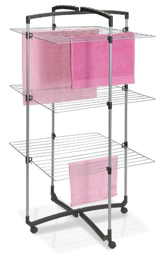 Séchoir à linge tour METALTEX Faro 3 étages rabattable avec charnière, sur roulettes montées. Possibilité de demi-ouverture. Espacement : 37 cm entre les plateaux. Dimensions ouvert : 64x69x134 cm. Etendage : 28 m. Coloris : blanc et bleu.