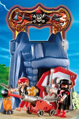Avec le rocher des pirates transportable 4776 de PLAYMOBIL, votre enfant s'amuse dans l'univers des pirates !Avec ses 2 personnages de pirates, son squelette, son rocher, son canon et ses accessoires, votre enfant aura de quoi faire. Bien conçu, le canon tire même des projectiles. Le squelette phosporescent brille dans le noir. Et le rocher est transportable.