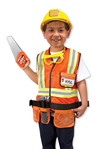 Je construis, je répare... Muni de mes outils je fais des miracles !Déguisement de petit bricoleur pour enfants composé d'un gilet, d'un casque, d'un marteau, d'une scie, d'une paire de lunettes et d'une étiquette.Le gilet sans manches est surplombé d'un filet de couleur orange. Il est agrémenté de bandes réfléchissantes jaunes et grises et d'un ceinturon qui permettra à votre enfant d'y ranger tous ses outils. En effet le costume est fourni avec deux outils : une scie et un marteau en plastique. Le casque est de couleur jaune tout comme les lunettes de protection qui sont également agrémentées de verre en plastique.Enfin pour compléter le déguisement, une étiquette pour y inscrire le prénom de votre enfant sera à insérer dans la poche transparente prévue à cet effet.Cette panoplie sera parfaite pour tous les événement déguisés de votre enfant, pour offrir ou à porter lors d'un carnaval !