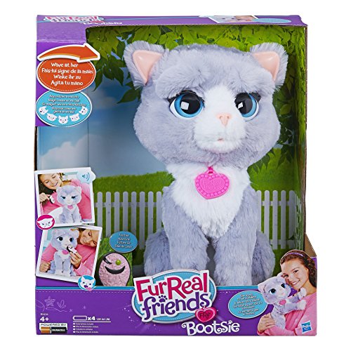 Adoptez Bootsie, le chat le plus câlin au monde ! Ce chat imite avec réalisme tous les comportements félins comme le ronronnement, les moments de complicité et de tendresse. Bootsie exprime également les sentiments d'un chat (joie, surprise, timidité). Ce jeu est conseillé aux enfants à partir de 3 ans. Offrez à votre enfant Bootsie le chat, le petit compagnon en fourrure Bootsie est un chat gris avec des hanches articulées et un museau blanc. Autour de son cou se trouve un collier rose en forme de coeur. Le chat de la marque FurReal Friends est doté d'un capteur sur son front qui lui permet de vous répondre quand vous lui faites un signe de la main ou lorsque vous le caressez. Appâtez Bootsie avec sa friandise préférée en forme de sushi et ce petit félin fera des sons comme s'il mangeait réellement sa récompense. Après une journée pleine de jeu, prenez Bootsie dans vos bras et faites-lui un gros câlin.