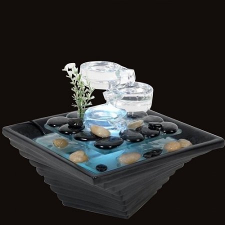 Somptueux mélange de verre et de céramique. Cette fontaine est élément de décoration originale, elle allie une association parfaite entre la céramique et le verre. Elle possède de plus un éclairage led blanc froid des plus agréables. Les points forts :- Association parfaite de la céramique et du verre.- Finition parfaite.- Eclairage led blanc froid. Caractéristiques Techniques - Hauteur : 20 cm- Diamètre : 23 cm- Matière : Verre et céramique.- Contenu : une fontaine, une vasque, une pompe avec LED, petits cailloux d'ornement.