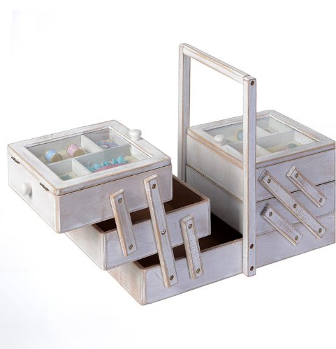 Munie d'une anse pour un transport facile, la boite à couture dispose de deux vitrines sur le dessus qui reproduisent le charme des merceries d'autrefois.Grâce à cette boite à couture, vous pourrez ranger bobines, fils, rubans, et dentelles.Avec un système de rangement en escalier, cette boite à couture offre de nombreux rangement et un gain de place appréciable.