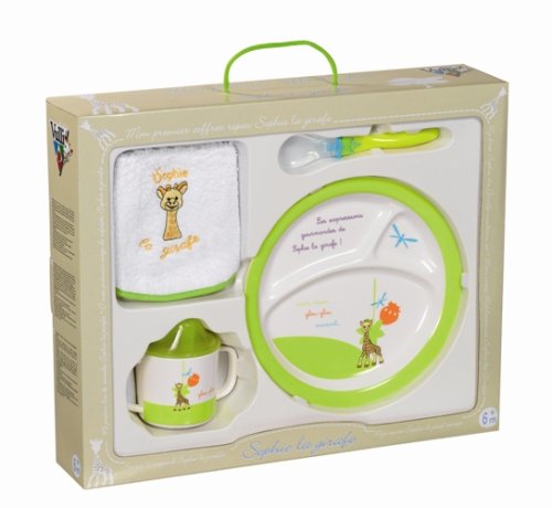 Pour les tous premiers repas de bèbè !6 mois +Comprend : - Une assiette compartimentèe, idèale pour apprendre à bèbèà diffèrencier les goûts et les saveurs. - Une tasse anti-fuite Sophie la girafe dotèe d'un bec ergonomique qui favorise la succion naturelle comparable au biberon. Avec système anti-fuite pour boire sans goutter. Ingènieux, cette tasse est èvolutive : en retirant le couvercle, elle devient un gobelet. Avec base anti-glisse et deux poignèes pour une bonne prise en main. Contenance : 180 ml. - Une cuillère douce avec embout en silicone adaptèe à la petite bouche de bèbè. Avec un long manche ergonomique pour atteindre le fond des pots les plus profonds. - Un adorable bavoir brodè en èponge 320 g avec attache velcro®.