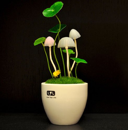 (24181, pot de porcelaine)Cette lumière décorative réagit à son environnement. Merci à capteur de lumière intégré, la lumière s'allume automatiquement au crépuscule et s'éteint à un environnement lumineux. Il est équipé de 3 champignons avec 3 ampoules LED qui brillent dans différentes couleurs. Les 3 LED est interchangeables. C'est une sorte de lampe très basse consommation. Les feuilles d'art décoratif peuvent être repositionnées dans le pot à votre aise. Sous la mousse verte d'art est un bouchon de mousse. D'économie d'énergie des ampoules à LED