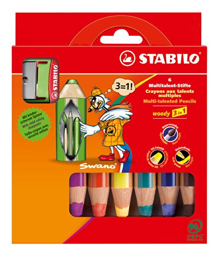 STABILO Crayon aux talents multiples woody 3 en 1, étui encarton de 6, rond, crayon couleur, crayon aquarellable etcraie grasse en un, épaisseur de la mine: 10 mm, longueur:115 mm, mine résistante, grande propriété couvrante, colorieaussi les surfaces lisses comme le verre etc., assorti dansles couleurs: jaune, rouge, erica, (8806-2)bleu ultramarine, marron, taille-crayon en plastique inclus